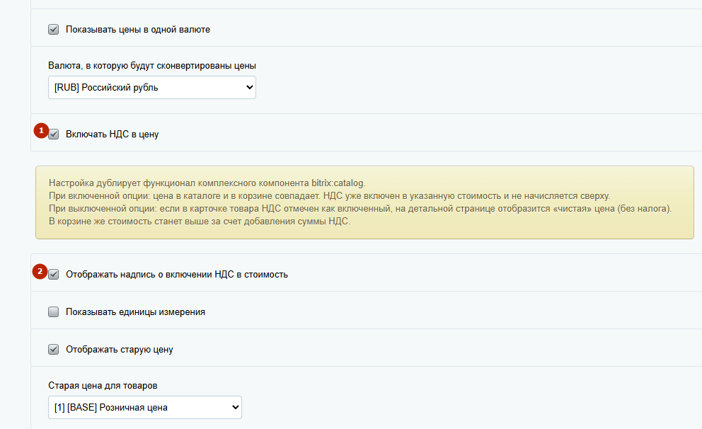 Поставьте галку в поле «Включать НДС в цену» (1), чтобы НДС учитывалась на сайте.