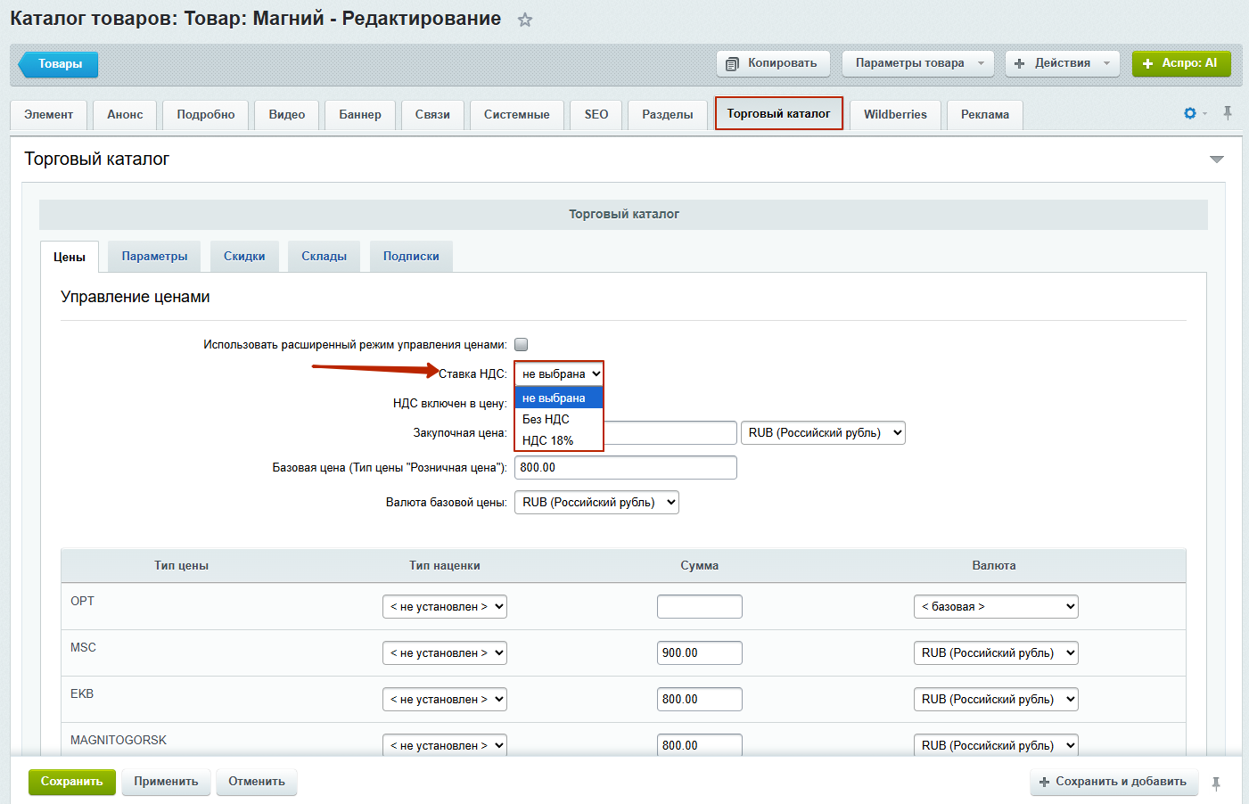 Затем перейдите в настройки конкретного товара. Во вкладке «Торговый каталог» найдите поле «Ставка НДС» и выберите подходящий вариант. Сохраните изменения.