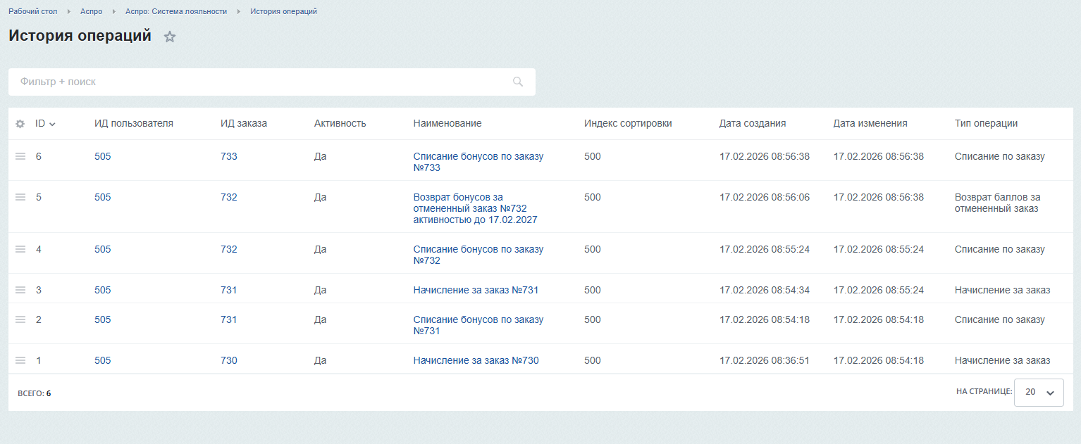 Раздел «История операций» нужен для отслеживания операций с бонусами. Элементы доступны только для чтения и используются исключительно для ознакомительных целей.