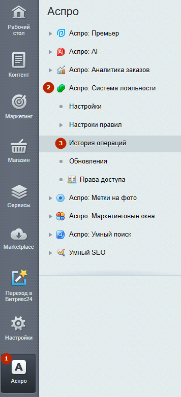 Чтобы посмотреть историю операций с бонусами, в административной части сайта перейдите в Аспро (1) → Аспро: Система лояльности (2) → История операций (3).