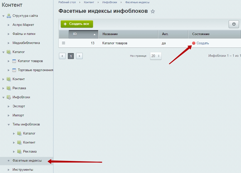 Если у вас не создано фасет каталога или возле индекса отображается красный индикатор, то создайте новый фасетный индекс. Нажмите кнопку «Создать все» или ссылку «Создать» возле существующего индекса.
