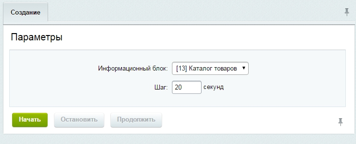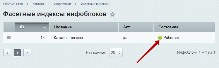 В списке «Информационный блок» выберите ваш каталог товаров. Нажмите кнопку «Начать». Если все прошло успешно, то возле созданного индекса появится зеленый индикатор и статус «Работает».