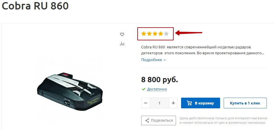 Рейтинг отображается на карточке товара и показывает, насколько высоко пользователи оценили товар. Рейтинг товара рассчитывается по среднему значению (сумма всех голосов / количество). Он формируется на основе ряда служебных свойств. Настроить показ рейтинга в каталоге можно через редактирование параметров компонента.