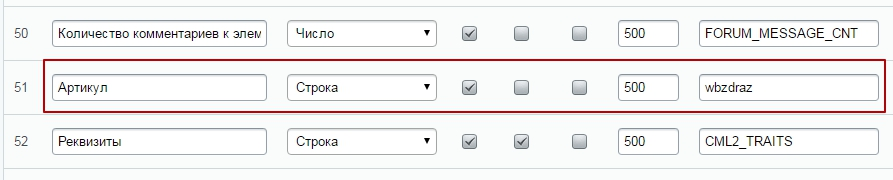 Найдите нужное вам свойство и проверьте его символьный код. В нашем случае это свойство «Артикул».