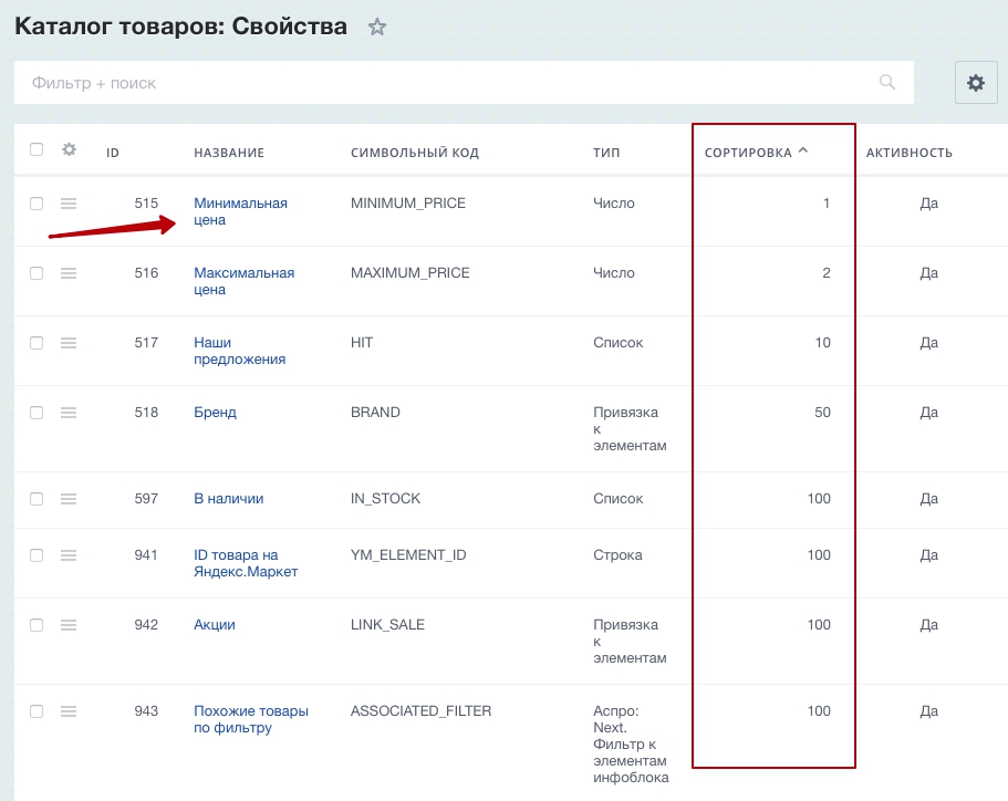 Активируя свойства в таблице, вы можете изменять порядок отображения свойств в фильтре. Настроить порядок отображения свойств поможет статья — https://aspro.ru/docs/course/course46/lesson2297/. К примеру, если вы хотите добавить в фильтр сортировку по цене, добавьте в него свойство «Минимальная цена». Если хотите, чтобы свойство показывалось первым, поставьте число сортировки — 1.