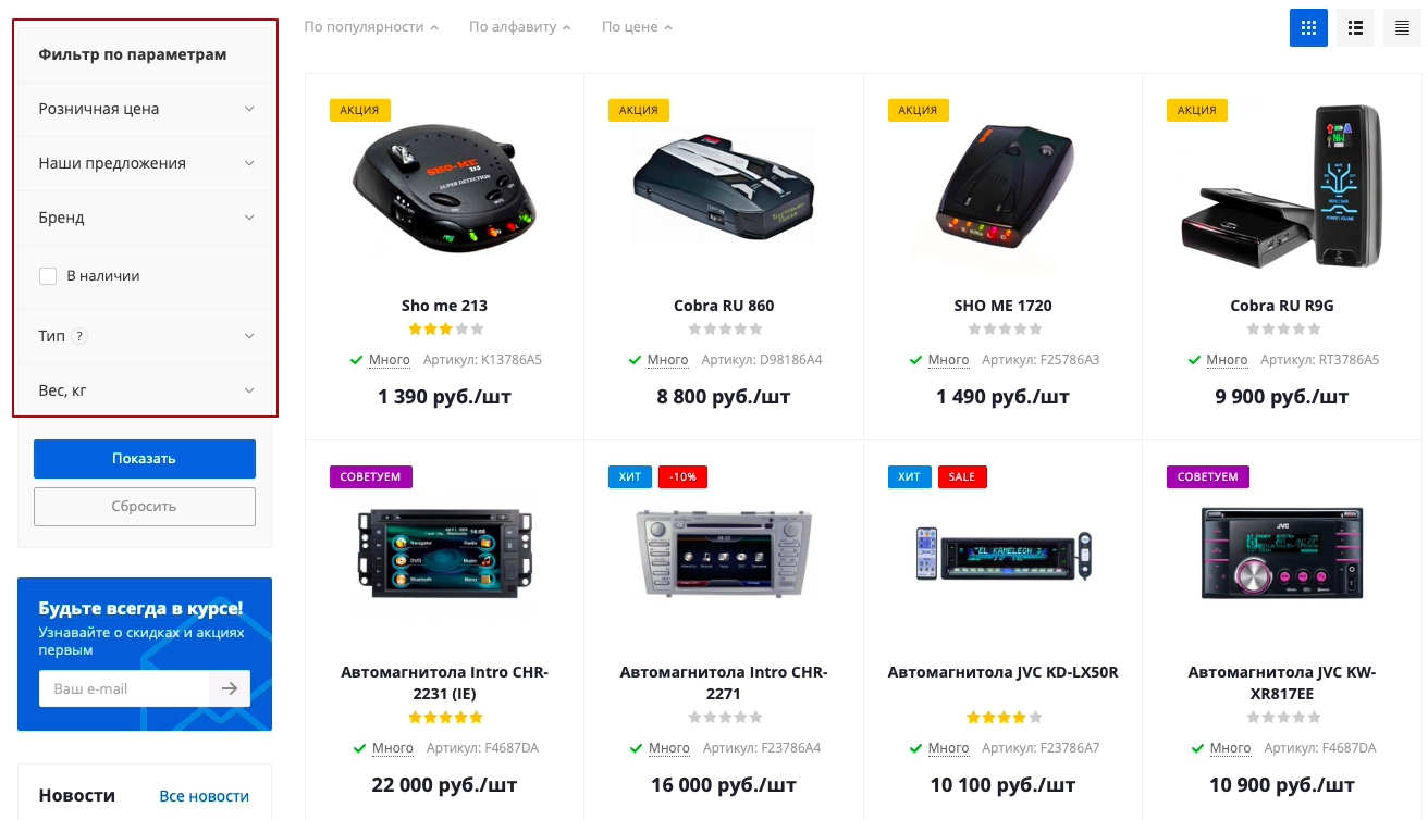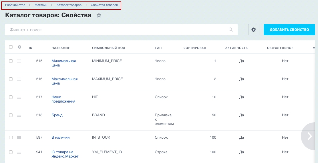 Добавляйте, убирайте свойства или меняйте сортировку в настройке торгового каталога. Для настройки переключитесь на административную часть сайта и перейдите в Магазин → Каталог товаров → Свойства товаров.