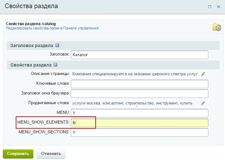 В поле «MENU_SHOW_ELEMENTS» установите значение «N» (нет). Это значение убирает отображение в левом меню элементов инфоблока. В нашем случае – товаров.