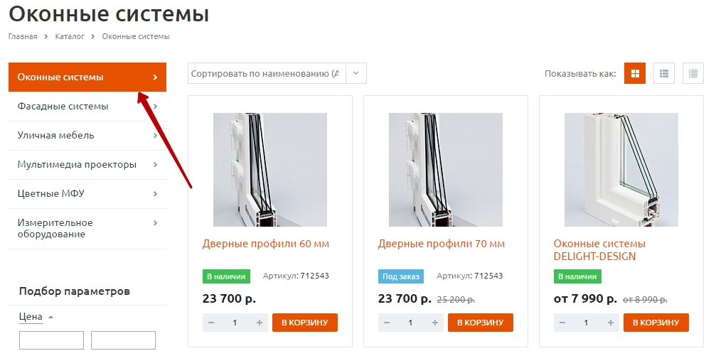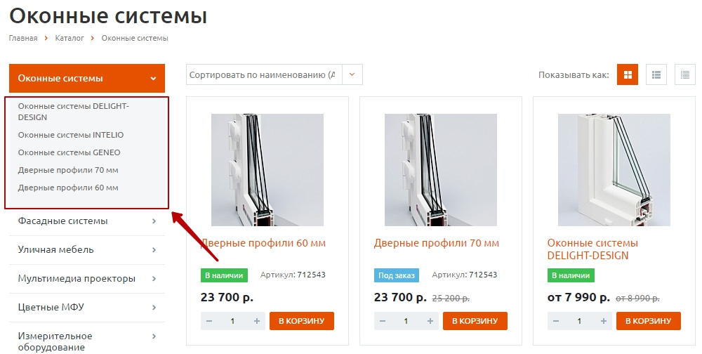 Отдельные товары подразделов каталога выводятся в левом меню так: