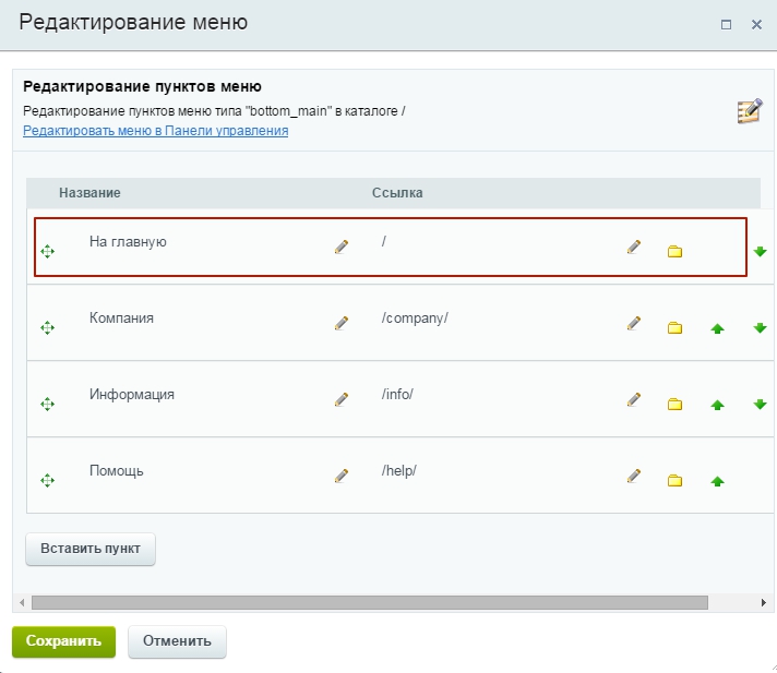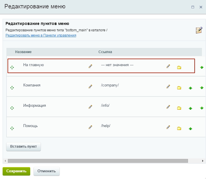 В столбце «Ссылка» напротив пункта «На главную» должен стоять слэш.