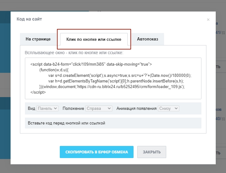 2. Скопируйте код формы для вставки на сайт, типа «Клик по кнопке или ссылке».