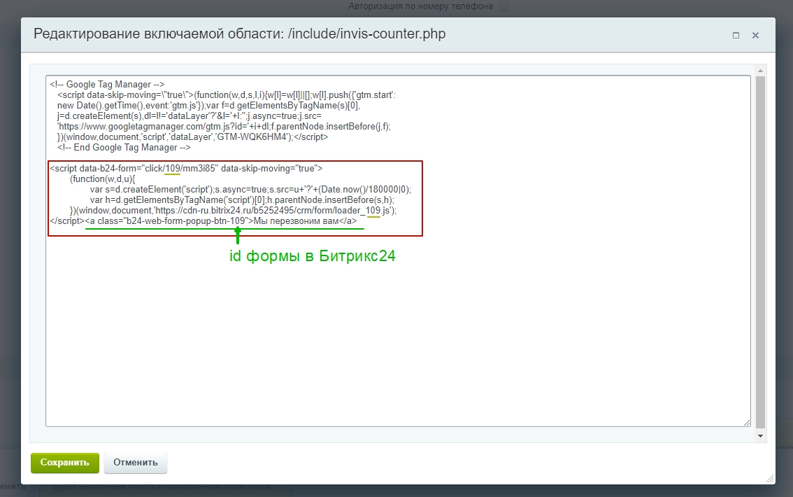 Перейдите в настройки сайта в административной части. В разделе «Цели и счетчики», нажмите кнопку «Редактировать» и добавьте в файл со счетчиками скопированный код формы.