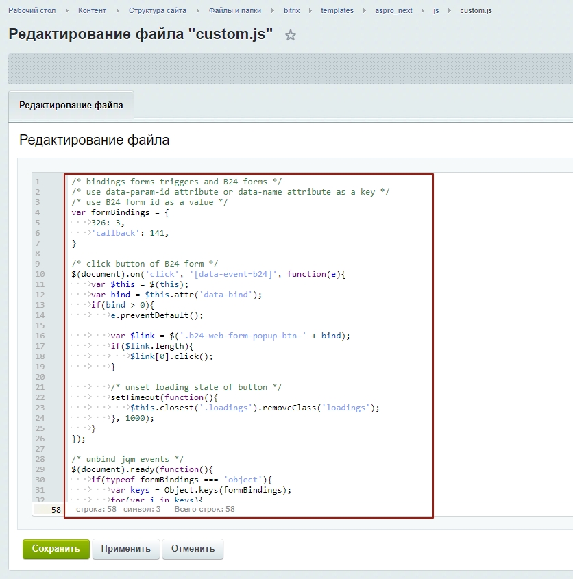 5. Далее, необходимо внести изменения в файл шаблона сайта, предназначенный для пользовательских скриптов. Путь к нему в оригинальном шаблоне решения /bitrix/templates/aspro-medc2/js/custom.js.