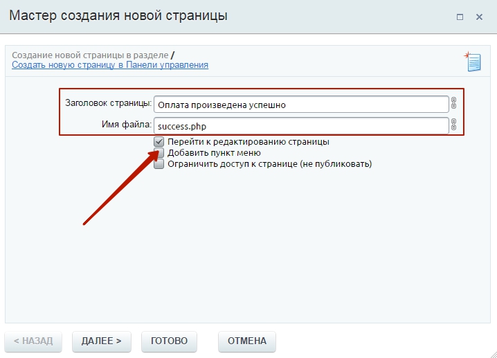 В открывшемся окне задаем заголовок страницы и имя файла. Убираем галочку с пункта «Добавить пункт меню» и нажимаем кнопку «Готово».