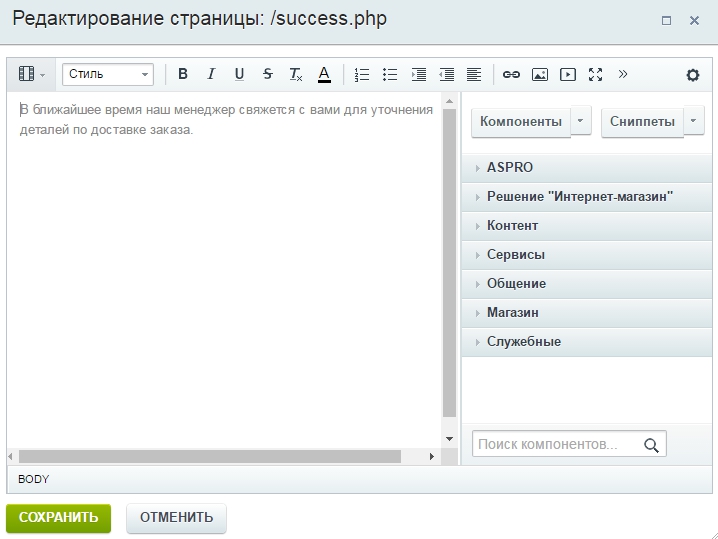 В открывшемся поле размещаем текст отчета об успешно проведенном платеже и сохраняем изменения.