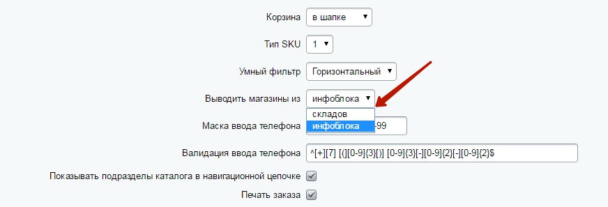 Найдите настройку «Выводить магазины из» и проверьте, откуда выводятся магазины: