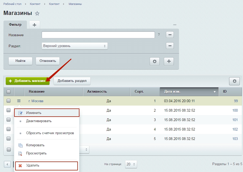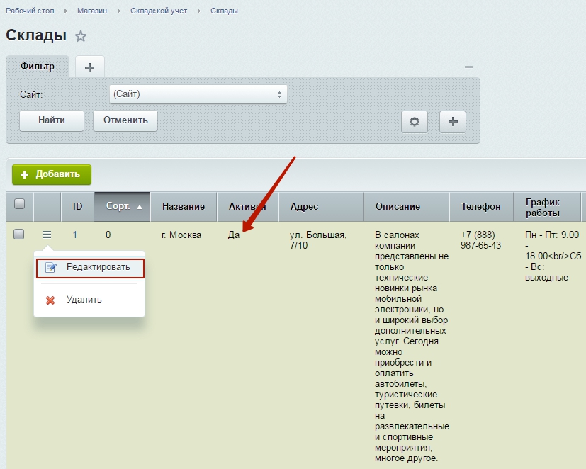 Здесь вы можете добавить или удалить магазин, отредактировать информацию о любом из них.