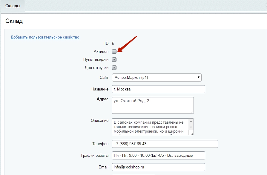 Внимание! В этом случае магазин не будет выводиться в списке складок на вкладке «Наличие».