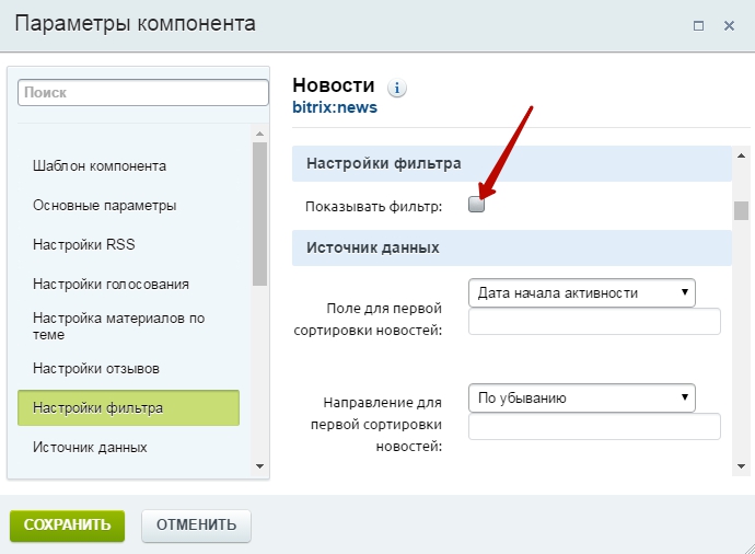 В режиме правки перейдите в настройки компонента «Новости» и отключите параметр «Показывать фильтр». Аналогичные изменения внесите в настройки раздела «Статьи».