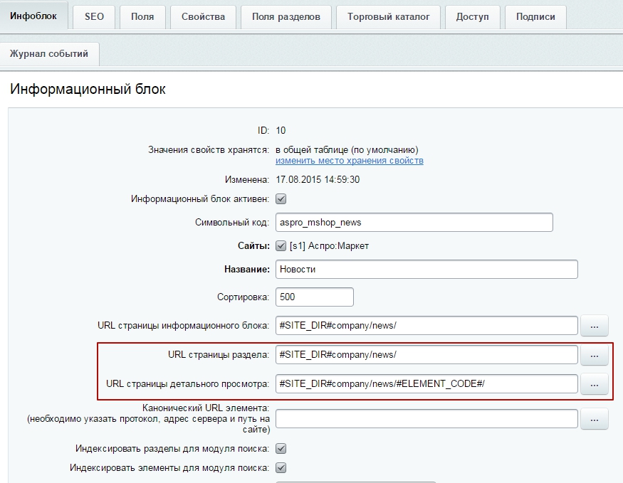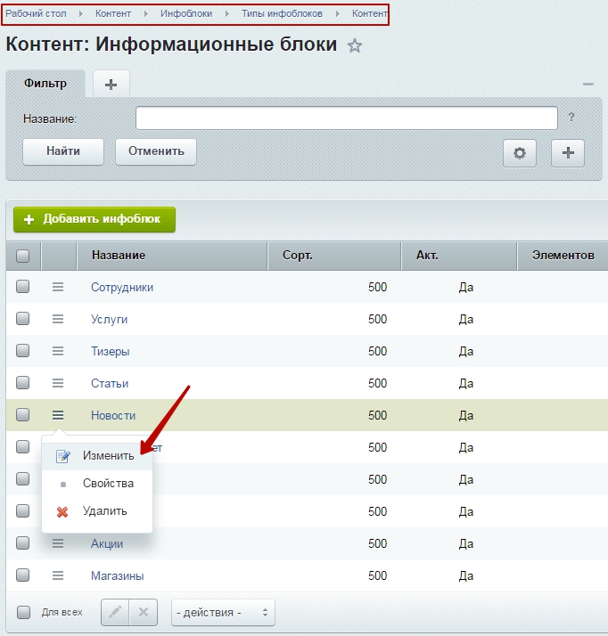 Далее синхронизируйте новые значения символьных кодов URL страницы раздела и страницы детального просмотра со значениями, указанными в настройках соответствующих инфоблоков. Для этого перейдите в настройки нужного инфоблока («Новости» или «Статьи») в административной части сайта.