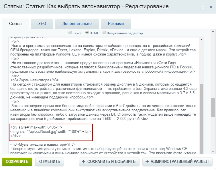 - Перейдите в режим редактирования нужной статьи или новости и переключитесь в режим HTML.
