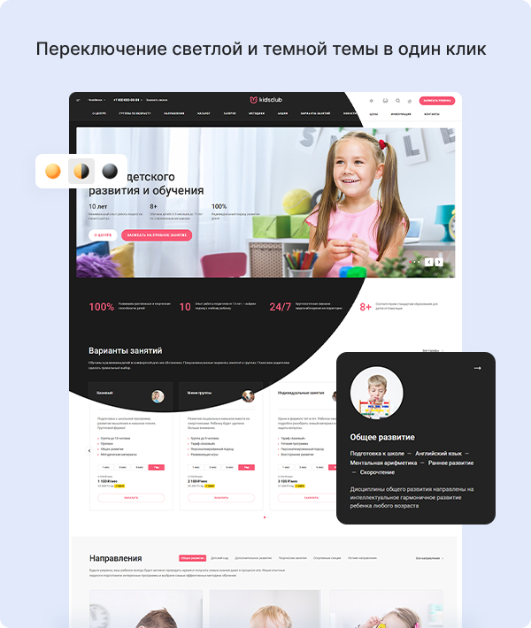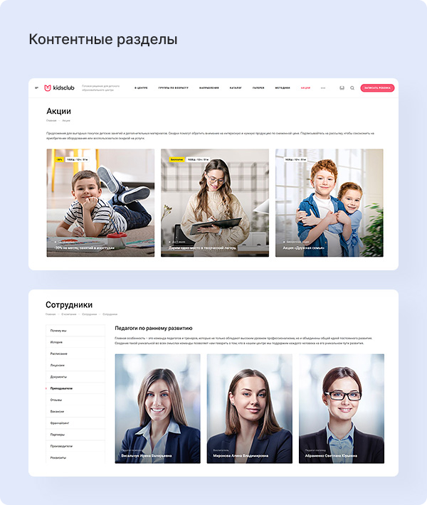 Готовый сайт адаптирован под тематику детского образования. Загрузите контент на сайт и приступайте к обучению.