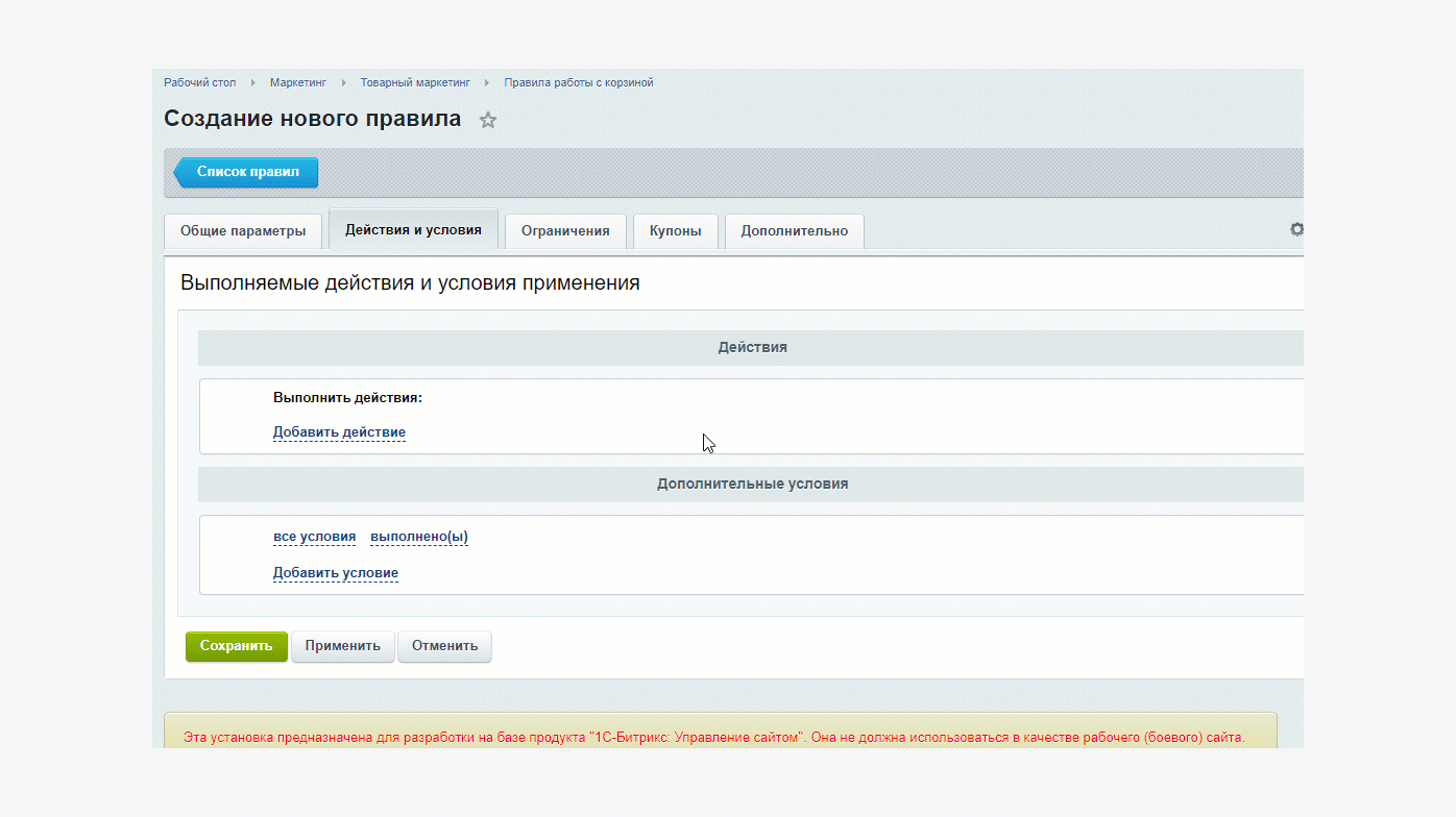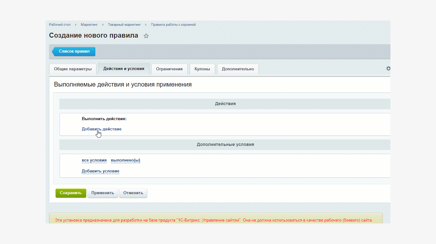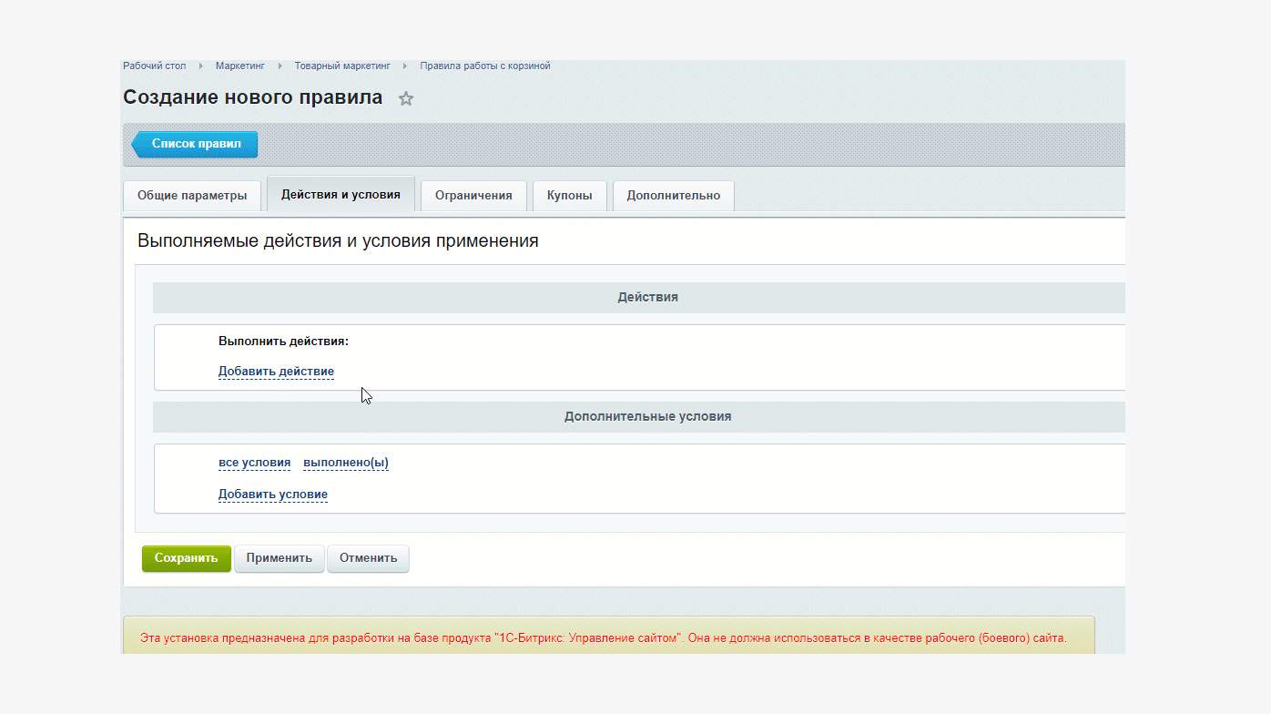 Как это работает. Зайдем в панель администрирования и перейдем в раздел «Маркетинг» (1). Далее проделаем путь до «Правил работы с корзиной» (2). Нажимаем «добавить правило» (3).