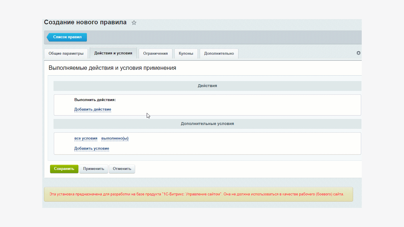 Перейдем к настройке скидки. На вкладке «Действия и условия» в поле «Действия» делаем: «применить скидку 10%». Далее в «дополнительных условиях» указываем «больше либо равно 5 000».