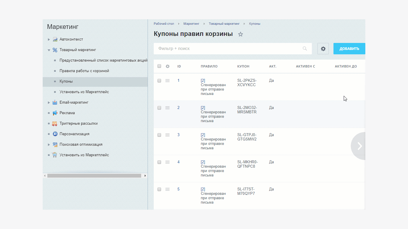 В 1С-Битрикс настроить купон для скидки можно следующим образом: Маркетинг → Товарный маркетинг → Купоны и нажимаем «добавить». Выбираем нужную скидку, проставляем активность и указываем тип – «купон на один заказ». Кликаем на «Сгенерировать код».