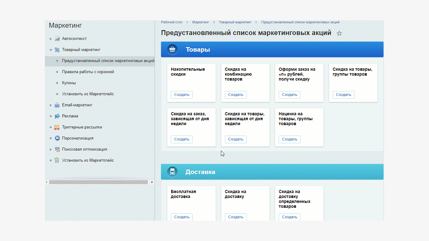 Простые скидки можно настроить и через «Предустановленный список маркетинговых акций». Там отображены стандартные шаблоны популярных сценариев.