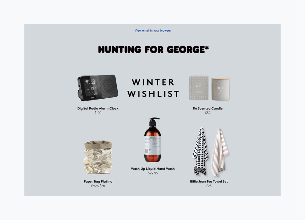 Еще один вариант — начать новогоднюю рекламную кампанию со списка желаний. Покажите своим клиентам подборку зимних товаров, которые вызовут интерес. Тогда они добавят предложения в список своих праздничных покупок. По такому принципу действовала компания «Охота за Джорджем».