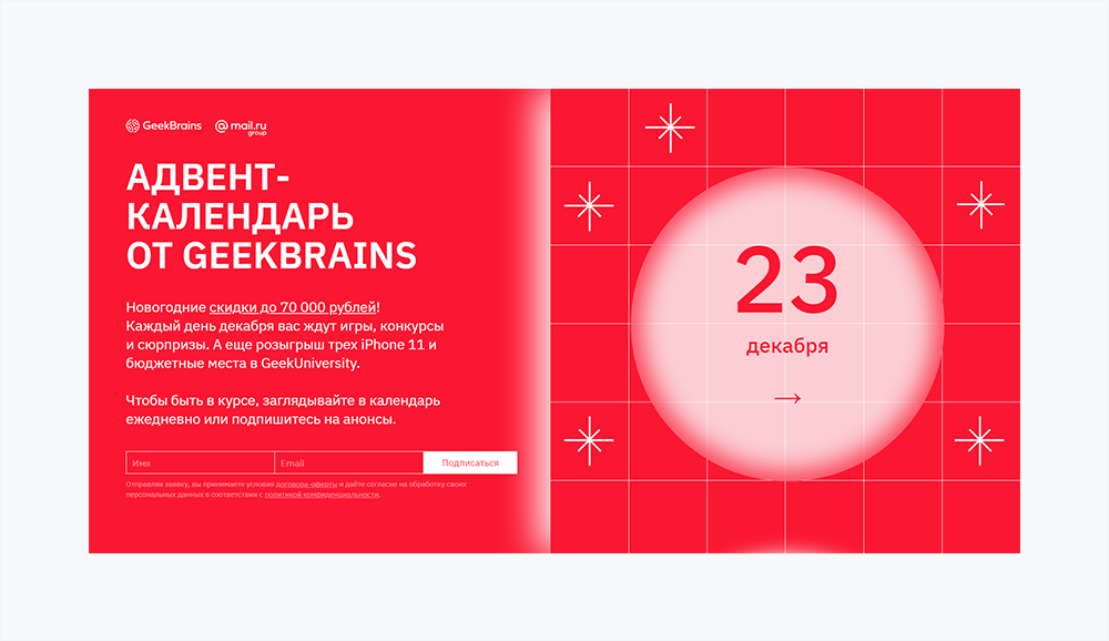 - Образовательный портал GeekBrains запустил адвент-календарь. Каждый день декабря посетителей ждут игры, конкурсы, сюрпризы и розыгрыш призов. Например, 19 декабря компания подготовила онлайн-квест. В нем можно было выиграть бесплатное обучение на любом из факультетов и получить один из трех сертификатов на 5 занятий английским от SkyEng.