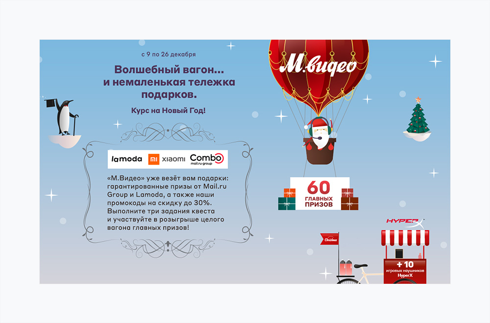 - В завершение еще один креатив — новогодний утренник Aviasales. Для участия в розыгрыше 100 билетов нужно выполнить любые 5 заданий. А за выполнение некоторых из них можно получить подарки от партнеров.