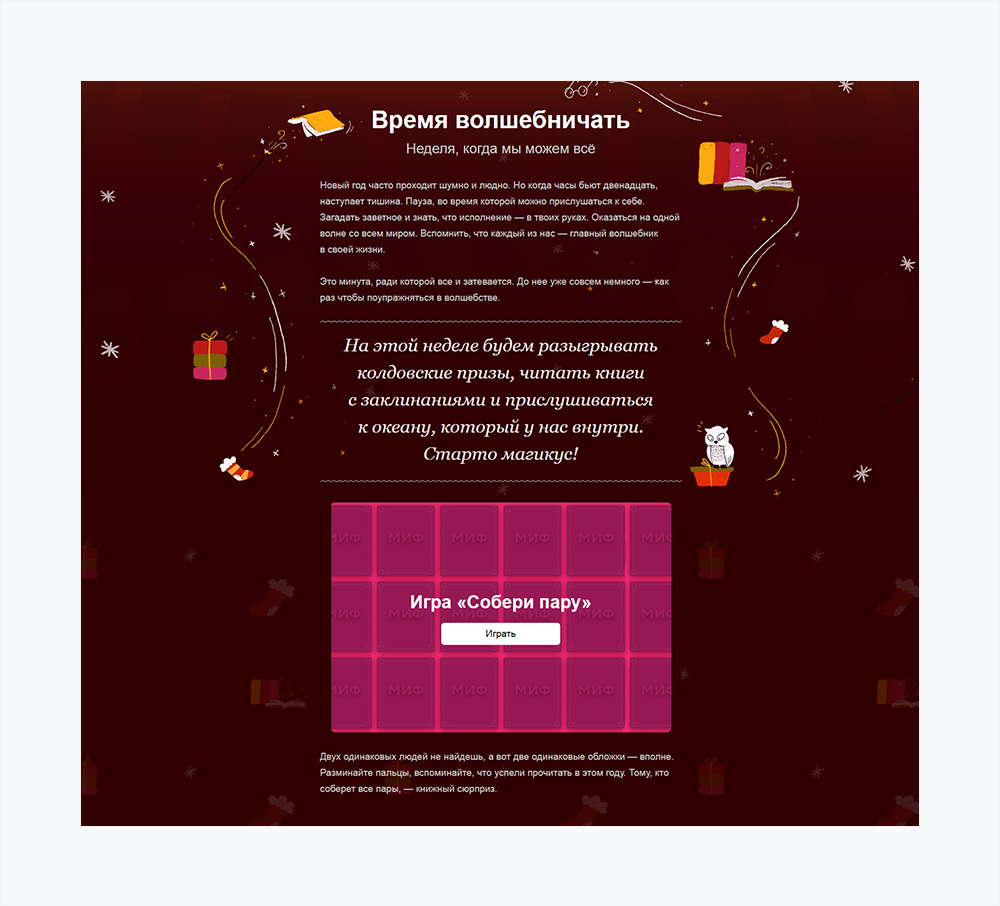 - Издательство Манн, Иванов и Фербер придумали акцию «Неделя, когда ты можешь все». В нее входит игра «Собери пару». Тому, кто соберет все одинаковые обложки книг, дарят сюрприз. Компания предоставляет скидку 50% на книги и во все заказы добавляет новогодние подарки. Также все покупатели интернет-магазина автоматически участвуют в розыгрыше призов.