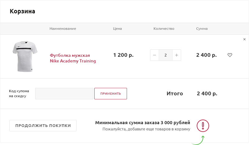 Нас часто спрашивали, как ограничить возможность оформления заказа по сумме, потому что в некоторых случаях доставка маленького заказа просто нерентабельна. В настройках модуля мы добавили возможность задать минимальную сумму заказа и текст предупреждения, который увидит пользователь при оформлении заказа.