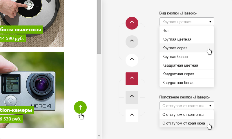 Небольшое косметическое изменение, которое способно существенно облегчить навигацию по длинным страницам - кнопка “Наверх”. Она легко настраивается и подключается в настройках модуля. Вам не нужно больше ставить сторонний компонент, весь функционал работает по умолчанию из коробки. Доступны 6 вариантов оформления и 2 варианта расположения кнопки.