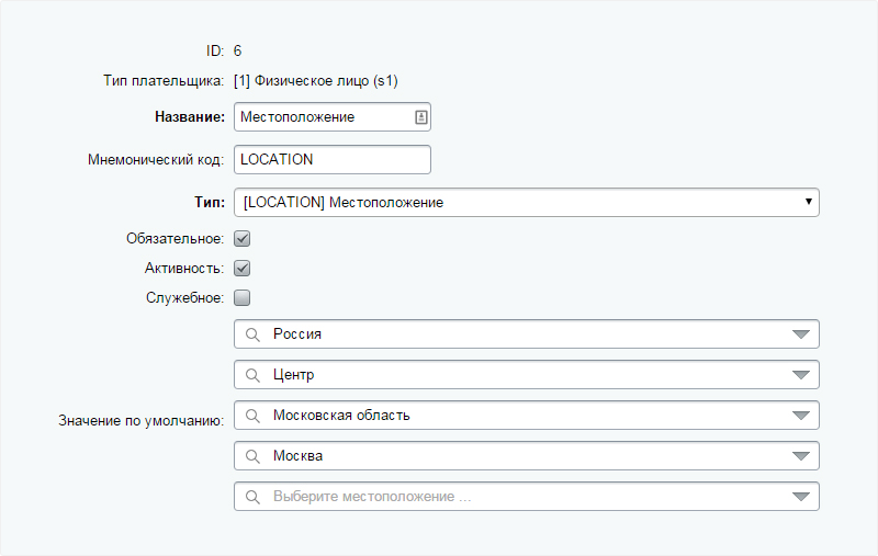 Местоположение по умолчанию можно настроить отдельно для каждого типа плательщика. Для этого перейдите в настройки свойств заказа