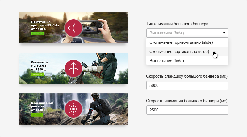Мы добавили настройки скорости переключения и вид анимации переключения баннеров на главной странице.
