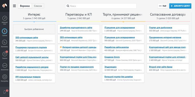 - Формирования базы клиентов, ведения сделок и обработки входящих заявок. Сотрудники могут создавать воронки продаж с разными этапами. Карточка сделки автоматически попадает на доску Kanban, где удобно отслеживать статус задачи — от заявки до подписания договора. Воронка продаж с автодействиями помогает ускорить процесс обработки лидов и не потерять связь. Напоминания подскажут, когда нужно позвонить покупателю. А карточки клиентов содержат подробную информацию об истории взаимодействия. Благодаря этому менеджеру не нужно начинать диалог с нуля, он может предлагать более релевантные товары и услуги на основе предпочтений и прежних заказов клиента. Кроме того, в CRM-отчете находится вся информация по сделкам и продажам, чтобы руководитель мог проанализировать работу менеджеров и найти проблемные места в коммуникации с клиентами.