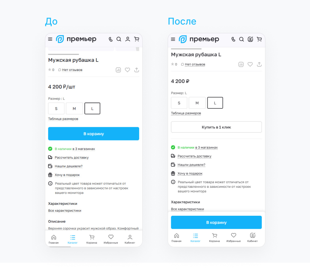 Также улучшили юзабилити решения на мобильных устройствах: изменили механику выбора SKU и закрепили кнопку «В корзину» в карточке товара. Изменения обновления помогут сократить путь пользователя до покупки.