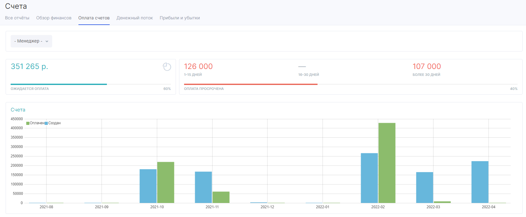 Отслеживайте оплаченные и просроченные платежи клиентов с помощью отчета по счетам.