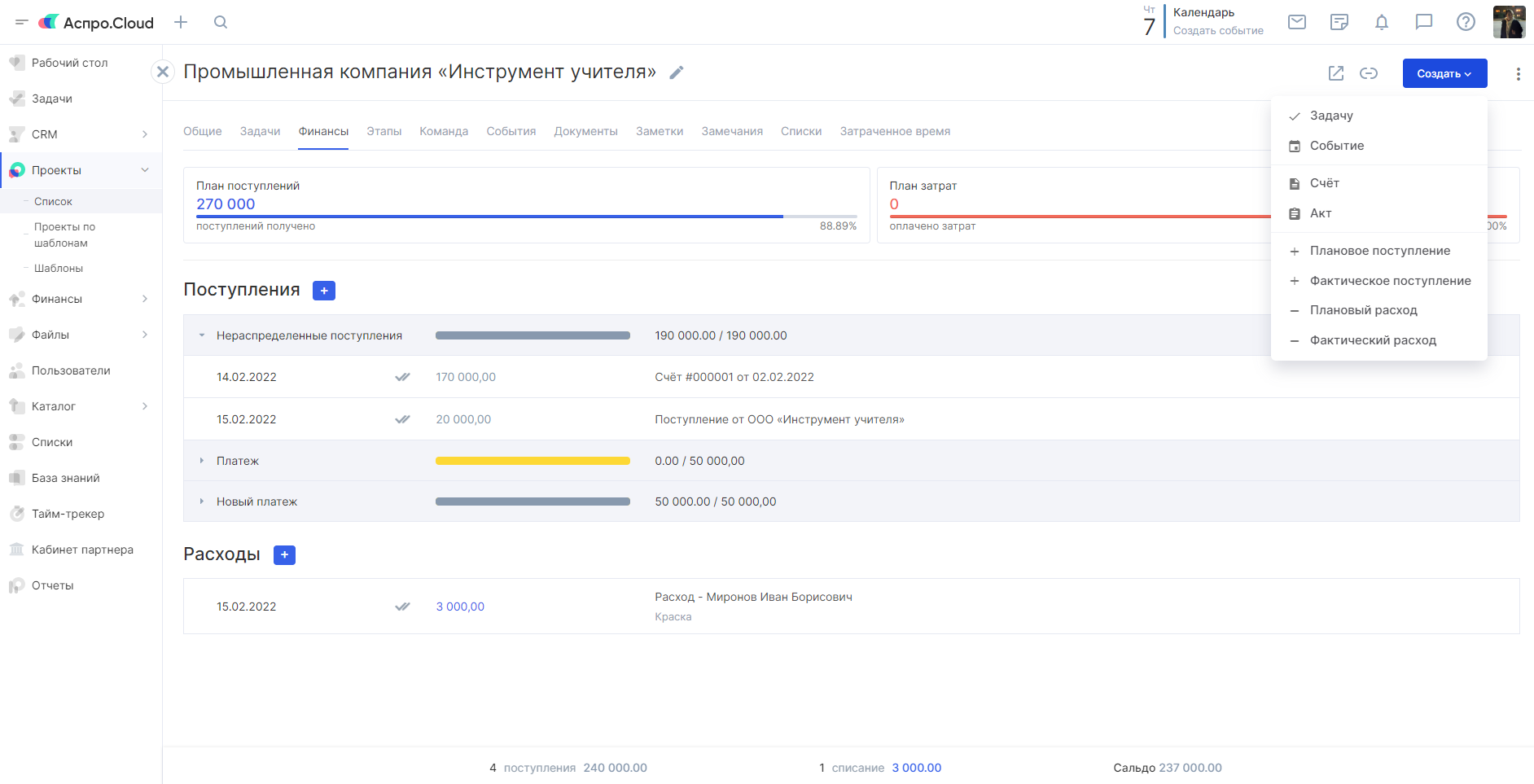 Из проекта можно также самостоятельно управлять бухгалтерскими документами: сгенерировать акт или счет на оплату и привязать его к плановому поступлению. Если изменились сроки или стоимость проекта, плановые финансовые значения тоже можно отредактировать.