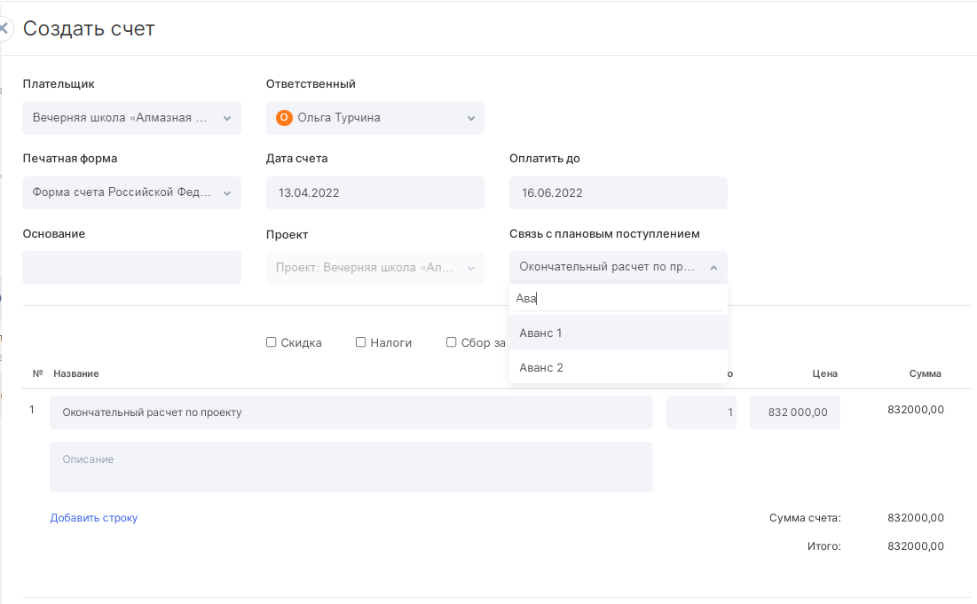 Счета не выставляются просто так. Чаще всего это ожидаемые средства, которые учтены в бюджете. Чтобы было проще ориентироваться и контролировать плановые и фактические доходы в денежном потоке проекта, свяжите счет с плановым поступлением.