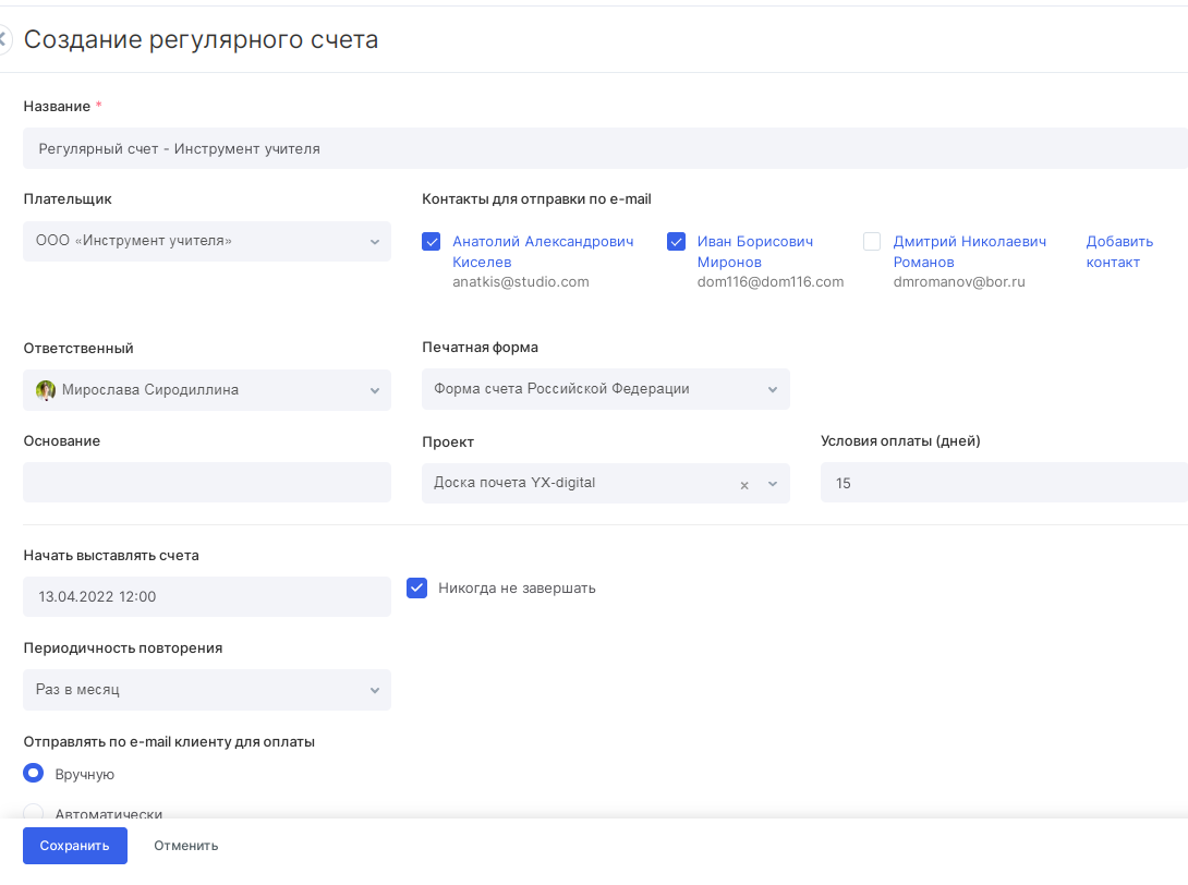 Если вы оказываете постоянную услугу, например, ведете соцсети, вы можете создать регулярные счета. Они автоматически отправляются клиенту.
