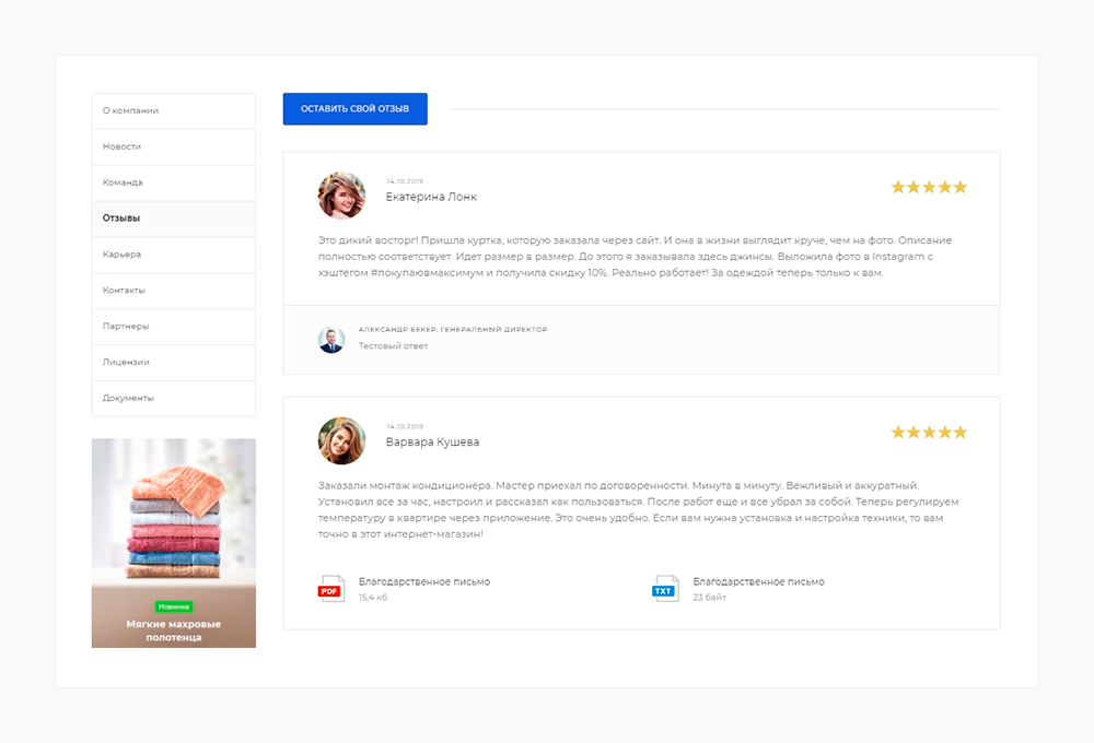 Отзывы о компании отправляются через форму: с фотографией клиента/компании и текстовым наполнением.