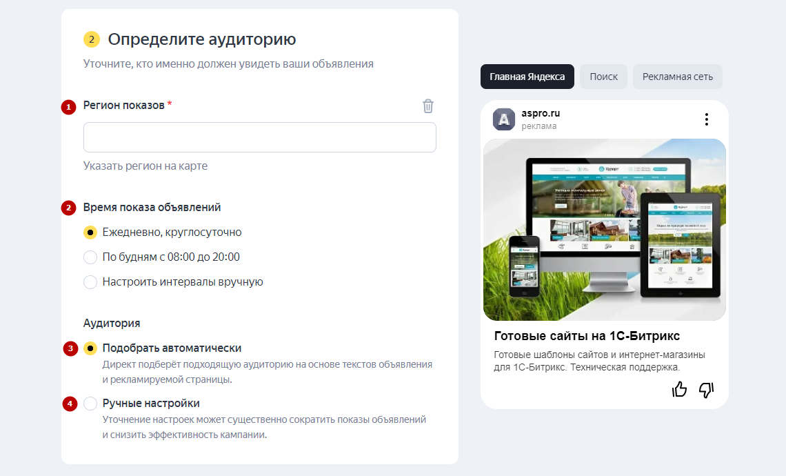 Определите регион (1) и время (2) показов. Выберите подходящий вариант настройки аудитории: автоматический (3) или ручной (4).