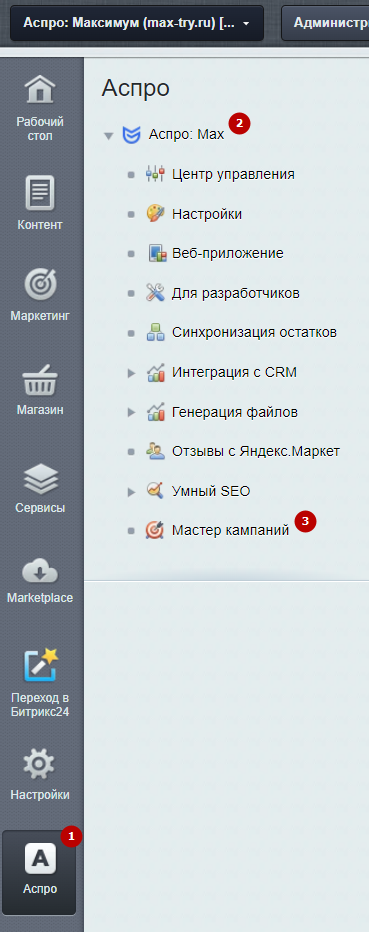 - Проделайте путь Аспро (1) → Аспро: Max (2) → Мастер Кампаний (3).