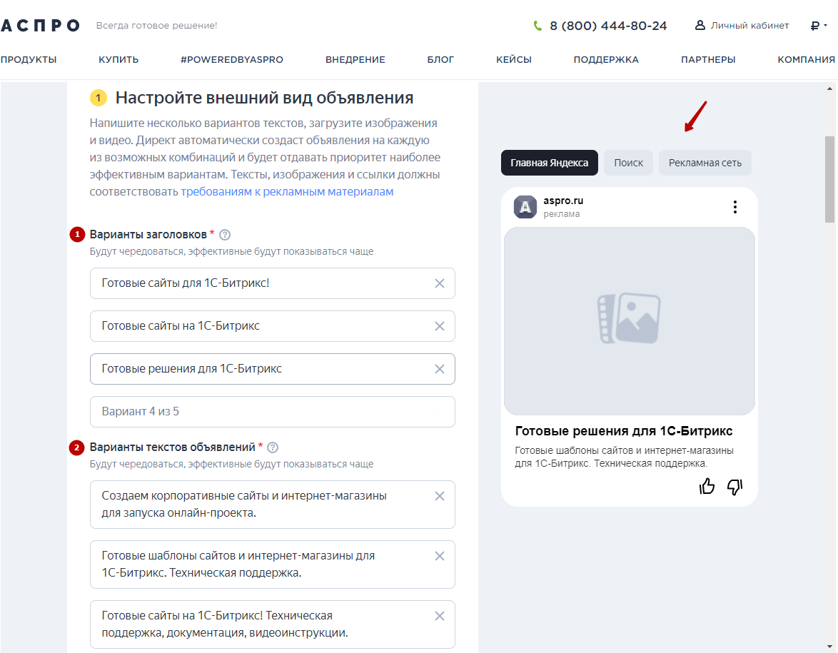 Аспро: Максимум интегрирован с виджетом Мастера Кампаний от Яндекса. Рекламируйте любой раздел вашего интернет-магазина: посадочную страницу, карточку товара или новость про акцию. Пользователи увидят вашу рекламу сразу в поиске, на площадках Рекламной сети и Главной странице Яндекса.