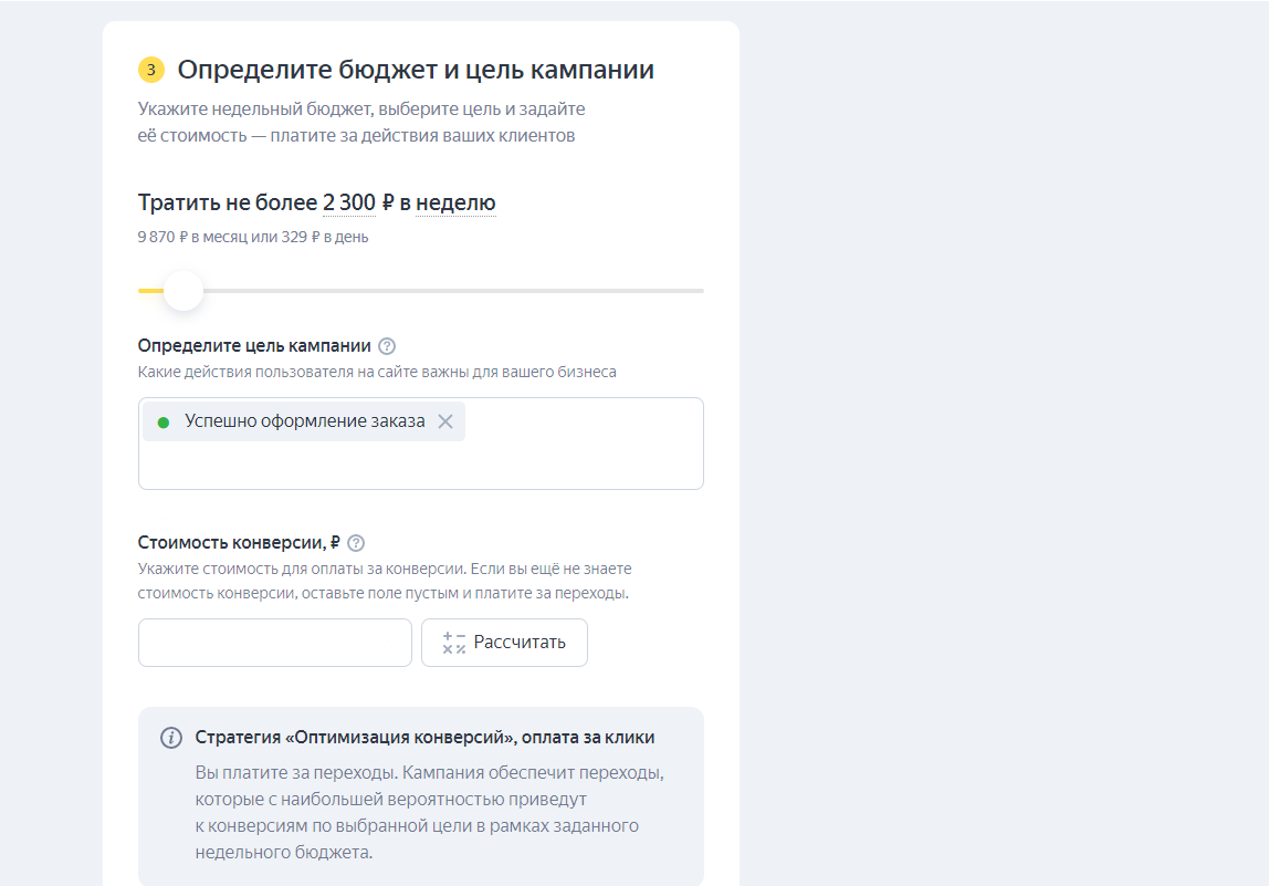 Настройте бюджет и установите цели. Вы также можете рассчитать стоимость конверсии.