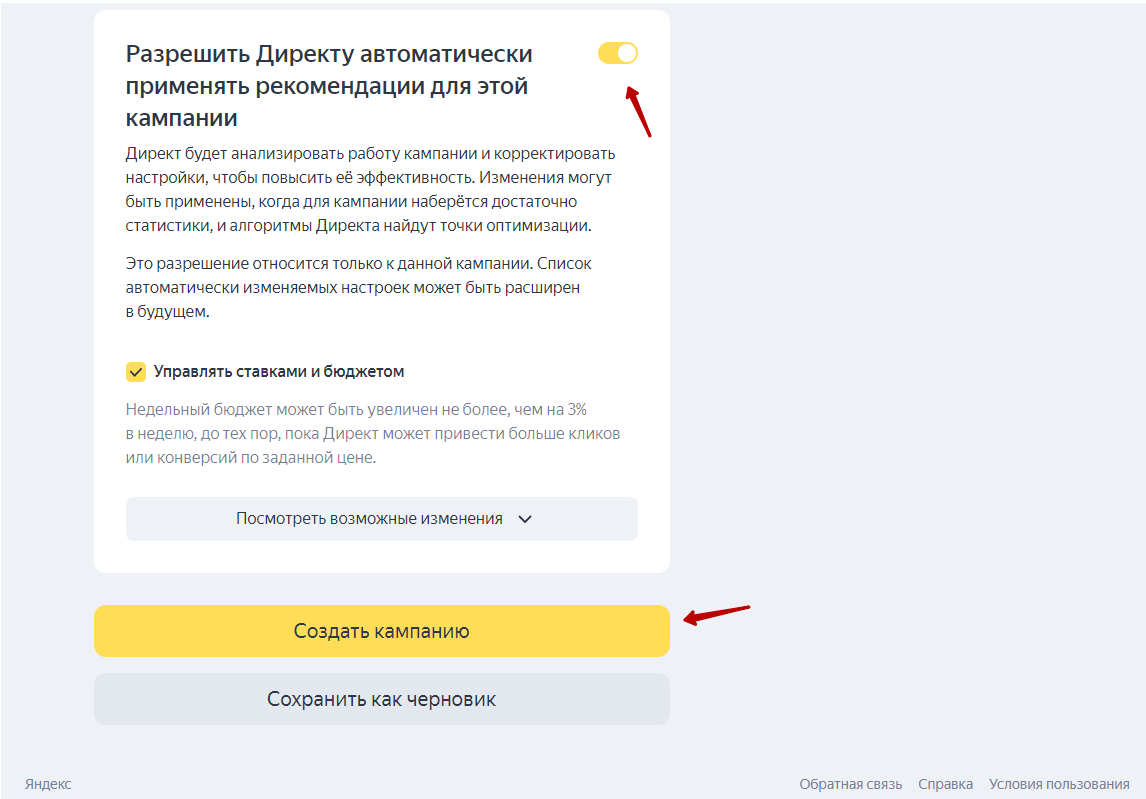 Разрешите или запретите Яндексу самостоятельно вносить изменения. А затем нажмите на кнопку «Создать кампанию».