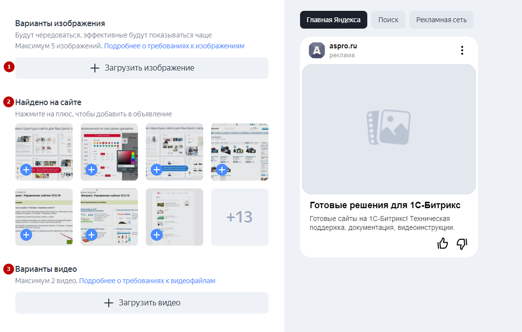 Загрузите изображения (1) или выберите из тех, которые мастер кампаний нашел на странице (2). При желании загрузите видео (3). Привлекайте внимание к своим объявлениям и получайте больше лидов.